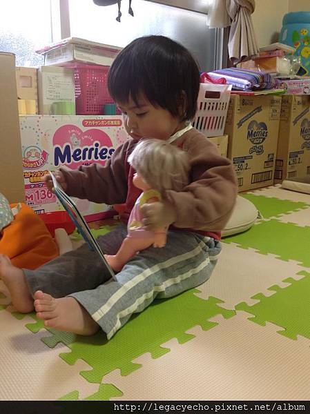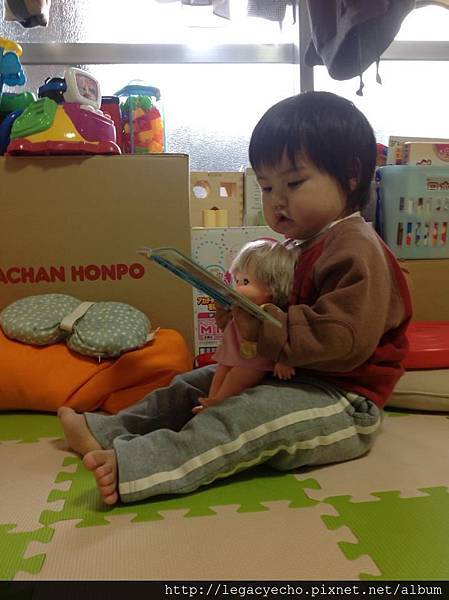亮亮為她的玩伴娃娃咪露將講故事,她不斷的調整姿勢,好讓咪露將可以看到圖畫書。