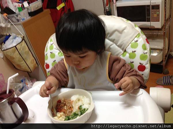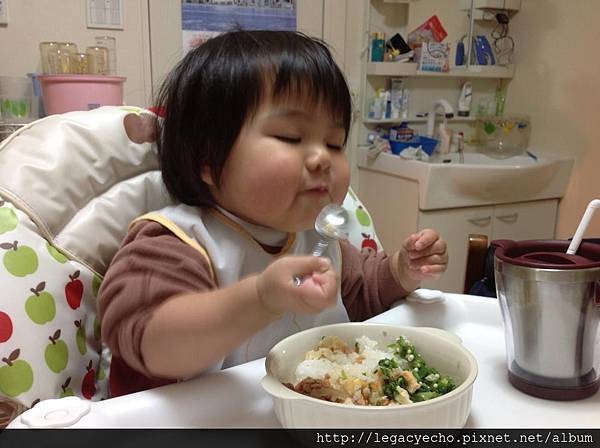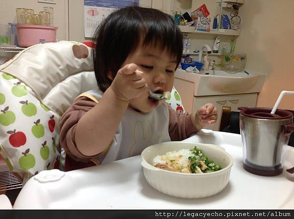 一歲六個月的亮亮已經可以獨立用餐,亮媽做菜調味清淡一些,對大人來說比較健康,小孩子也不會有太大負擔,與大人吃相同的食物,只是亮亮要吃的再用剪刀剪得較小塊。