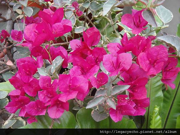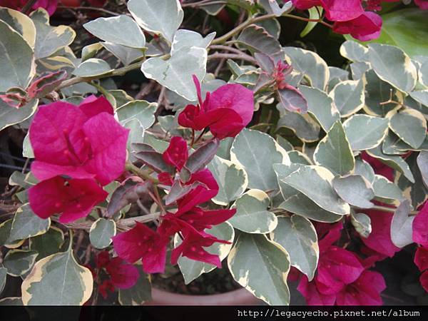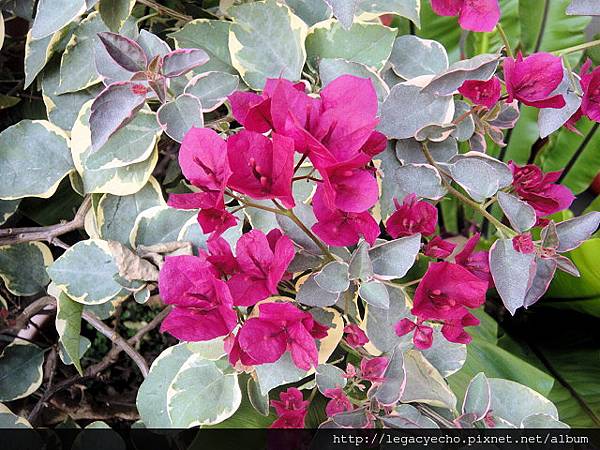 斑葉九重葛的花開時間,與原生種九重葛相較,沒有那麼頻繁。原生種九重葛帶刺不討喜,但是管理的好,日照充足,每三個月就大鳴大放一次,陽光下花開繽紛,常常就搶了園子裡其他花卉的鋒頭。