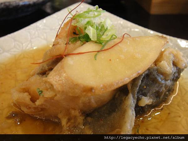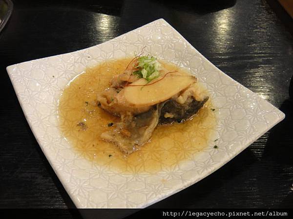 中食第三道 燒物 鮭魚頭酥炸後醬煮,薑與蔥提味。