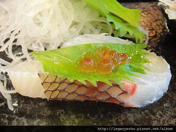 帶皮虎鱺魚腹佐鮭魚卵,魚皮處理得恰到好處。