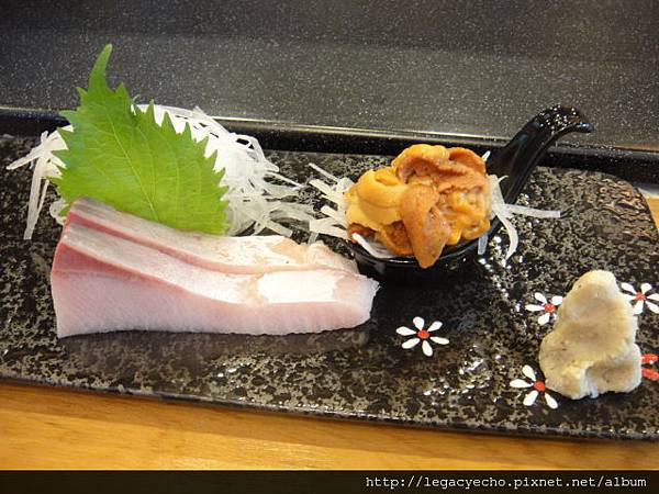 青魽魚腹生魚片及海膽,味美,值得細細品味。