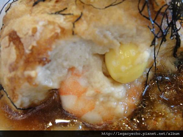 胡麻豆腐內包覆干貝、蝦仁、銀杏油炸成型,淋上醬汁。每日限定料理,一份80.-