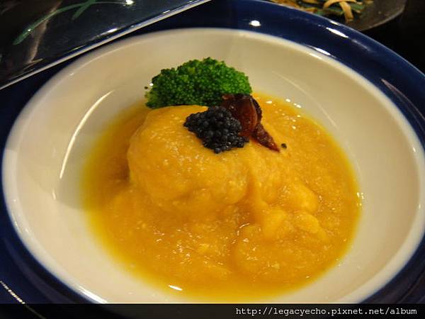 南瓜干貝蒸,以南瓜泥封住新鮮大干貝蒸,上飾魚子醬調味。單點一客180.-