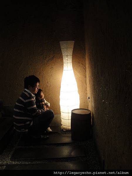 服務人員撤走桌面餐具,亮亮有了預備動作,因為店裡面的燈具、流水都吸引他的注意力。
