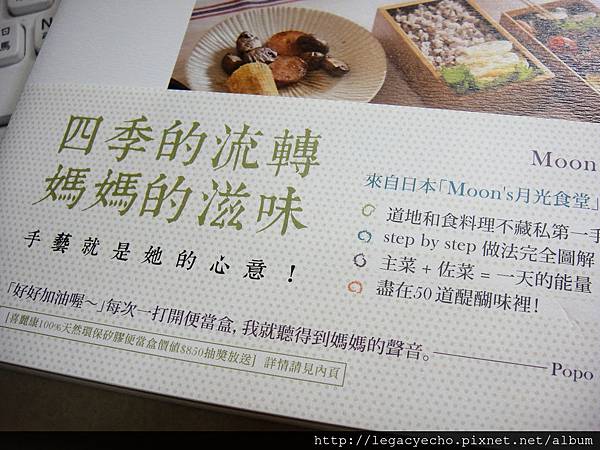 這本書是製作便當很好用的參考食譜,以季節編寫,也有食材索引,在書中除了可以學習各式佳餚外,還可以感受 Moon對家人呵護照顧的心。