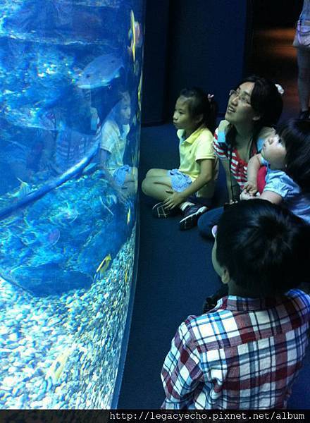 等著看海豚表演時,又寧教亮亮玩剪刀時頭布。