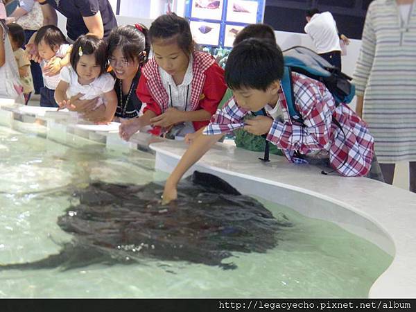 亮亮愛摸魚,摸好大的魟魚,輕輕撫摸,要魟魚乖乖在水池裡玩耍。