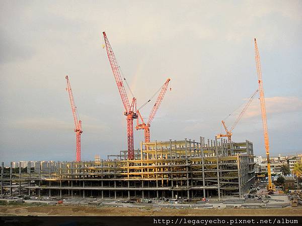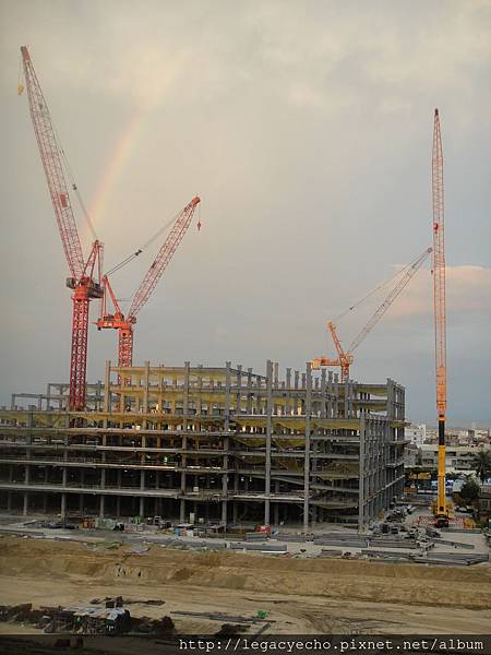 由陽台落地窗一瞥,夕陽的霞光映照在台南夢時代的鋼構工程上,覺得那幾部天車突然上了嫣紅。