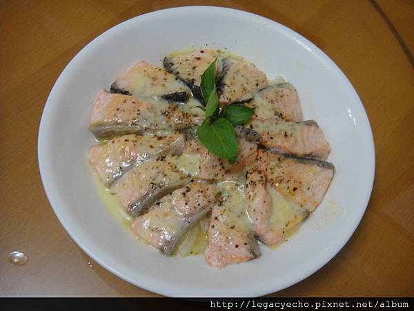 白醬洋蔥燒鮭魚,將洋蔥切細絲鋪底,上面在鋪上鮭魚片,淋上簡易白醬(蒜末奶油爆香加上一些牛奶勾薄欠),微波爐兩分鐘。