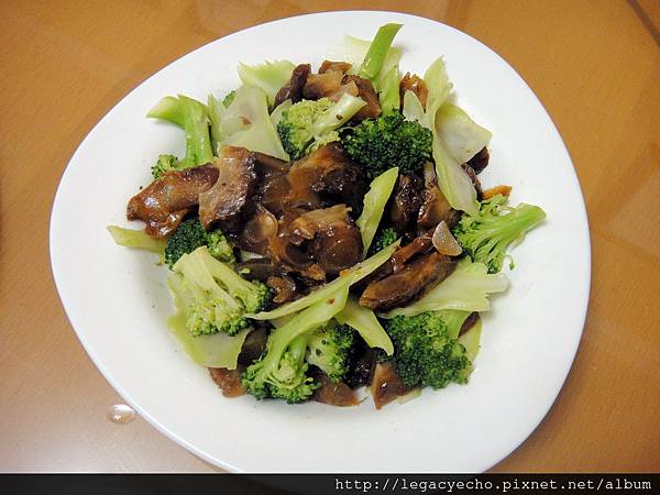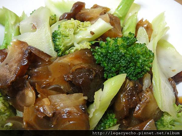 馮家牛肉的滷牛筋與清燙過的綠花椰菜拌炒一下,快快速速可上桌。