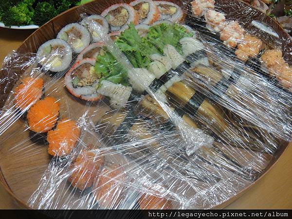 慈念(崇寧的親媽)準備了新都巷的握壽司,怕冷氣讓壽司飯過於乾燥,上桌時仍然用保鮮膜覆蓋,保鮮膜打開後,忘了重新拍照,想到要拍時,早已杯盤狼藉。