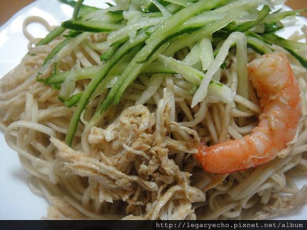 這一次天氣熱,我們就在家吃我煮的乾麵了,這麵拌入胡桃油、腰果碎粒、芝麻醬,還有雞胸肉絲及密碼蝦,看來不顯眼,用料挺高級的,加上小黃瓜絲,也是地中海型飲食法。