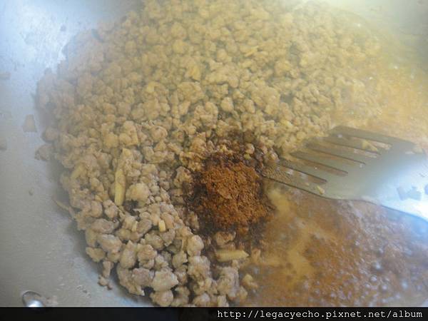 緊接著放入絞肉,利用以上兩種辛香料,煸炒絞肉去肉腥味。