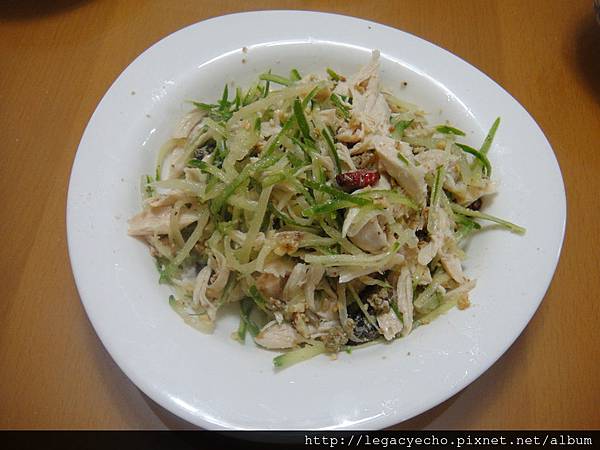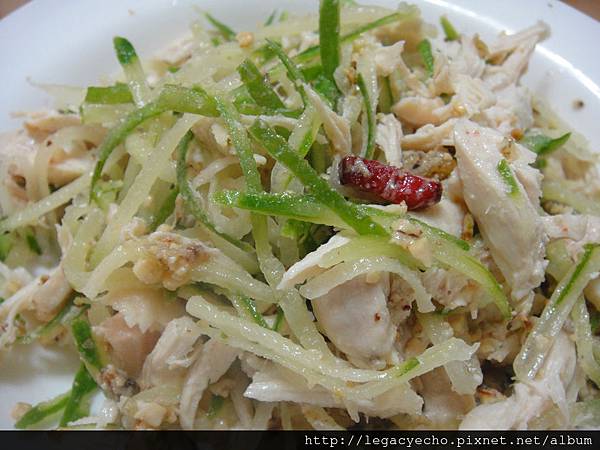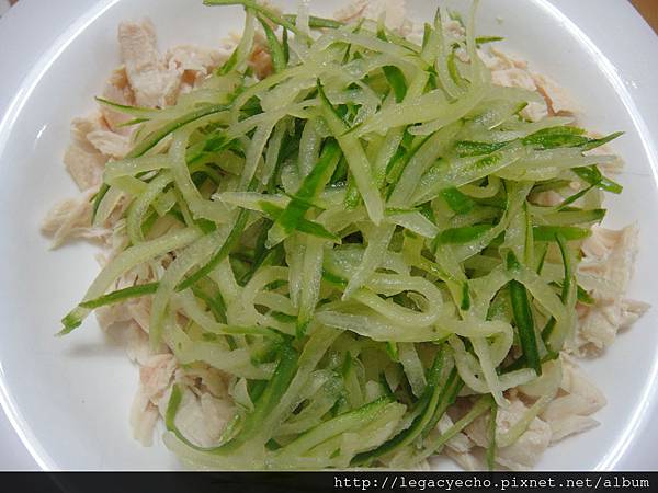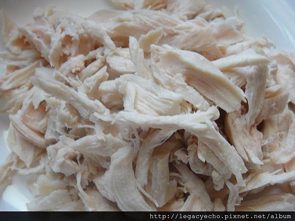 這道菜做法簡單,雞胸肉蒸熟放涼,撕成絲。