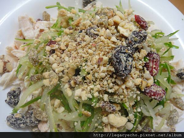 什錦堅果用調理機磨碎,加入小黃瓜雞絲中,增加口感。什錦堅果有調味,若覺得鹹味不足,可撒上少許玫瑰鹽。