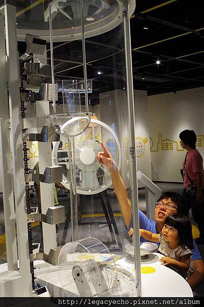 這是用手搖的方式,將一些圓球搖到上方的盒子再落下,模仿水力發電。