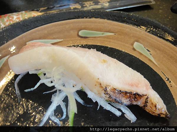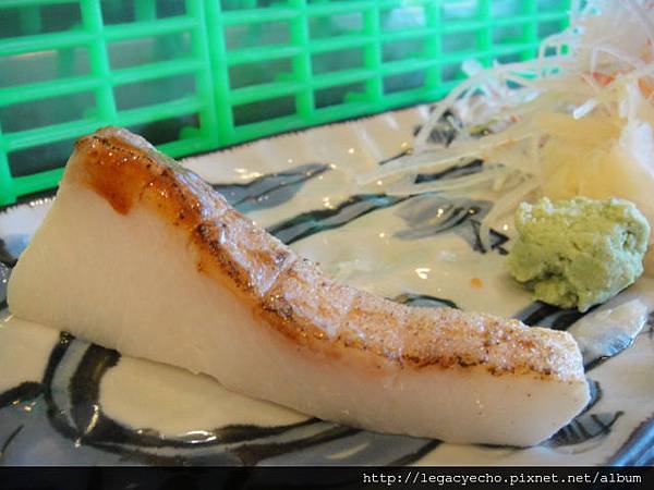 青魽魚腹是我極喜愛的生魚片部位,↑正面你看到油脂豐厚色澤粉嫩的青魽魚腹,但又充滿濃郁油脂被炙燒香氣。