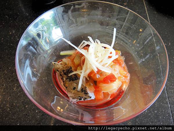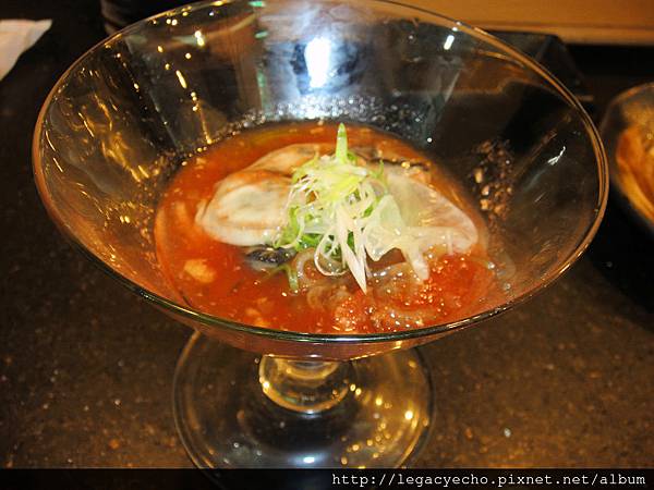 新鮮生蠔番茄檸檬風味,盛在高腳玻璃杯中,香醇如美酒入喉。