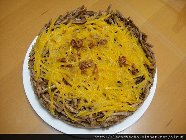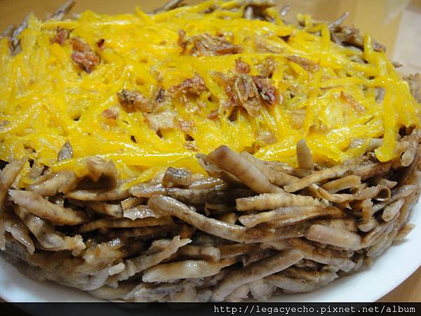 少許蝦米用酪梨烹調油爆香,芋頭絲與爆香後的蝦米,用檸檬風味的酪梨油、少許手工紅糖、少許純釀醬油,半碗在來米粉、扮均勻,將拌好的芋頭絲放入鋪好紗布的蒸籠內輕輕壓實,南瓜絲則撒入少許在來米粉,然後將沾了乾在來米粉的南瓜絲鋪在芋頭絲之上。