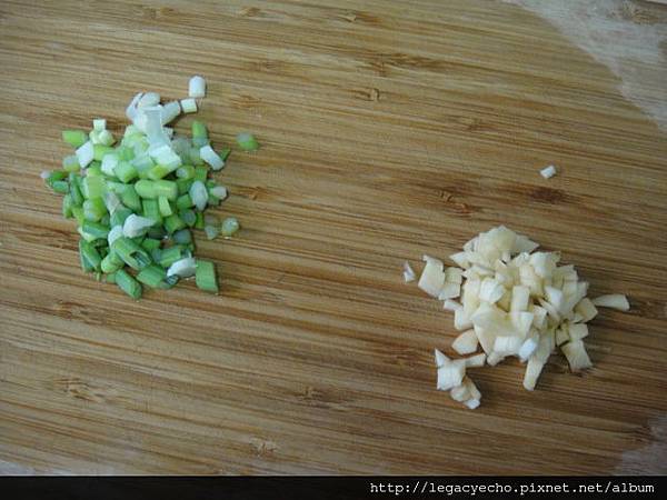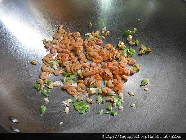 少許高溫烹調油,先下蒜末、再下蝦米,兩者香氣逼出後,放入蔥花。
