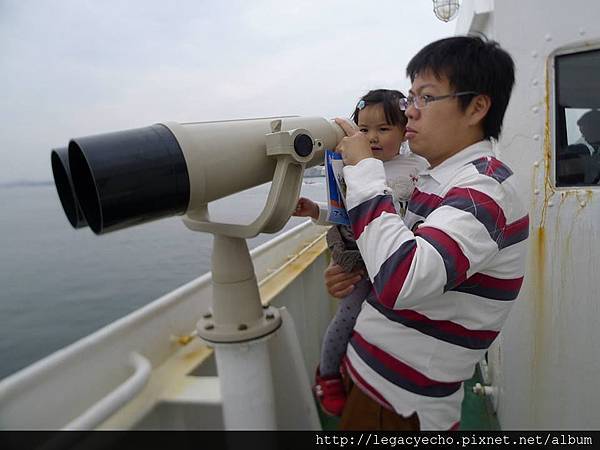 亮亮用望遠鏡看著海面,假裝和典樵叔叔做一樣的工作。