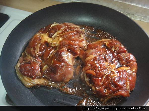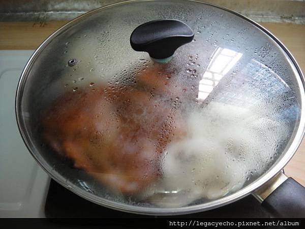 蓋鍋蓋小火煎焙,注意熟成度,以免雞腿肉過柴。
