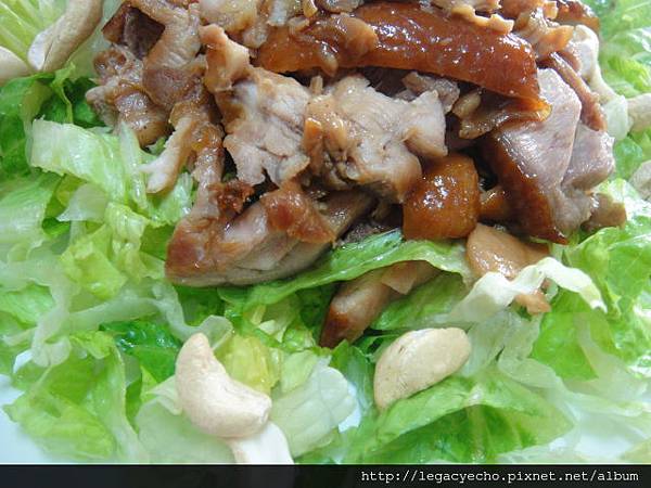 怕父親牙口不俐落,將雞腿排切絲拌入蘿蔓生菜絲,再撒上幾粒腰果仁。