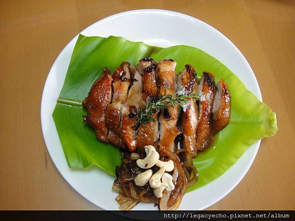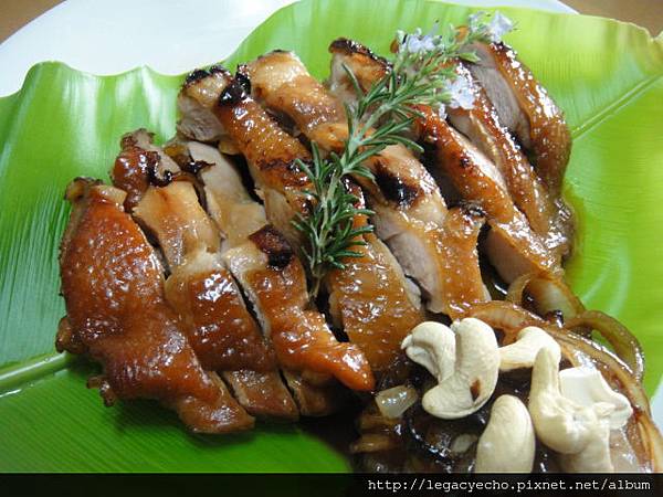 切片盛盤,墊上山蘇葉(自家陽台上的盆栽),飾以開花迷迭香。