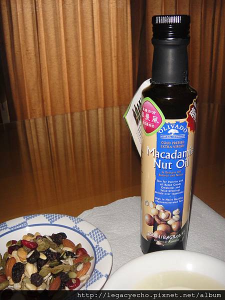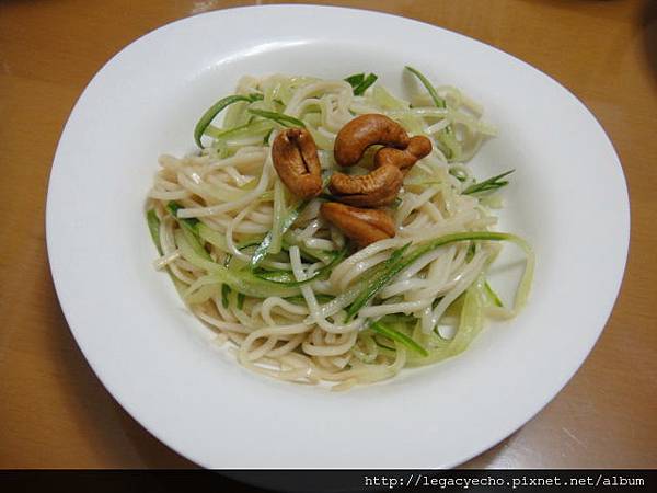 關廟麵煮熟,煮麵水放入少許鹽,瀝乾水分的麵條,淋入夏威夷豆風味油,快速攪拌均勻,再拌入小黃瓜絲,放上兩三顆蜂蜜腰果仁。