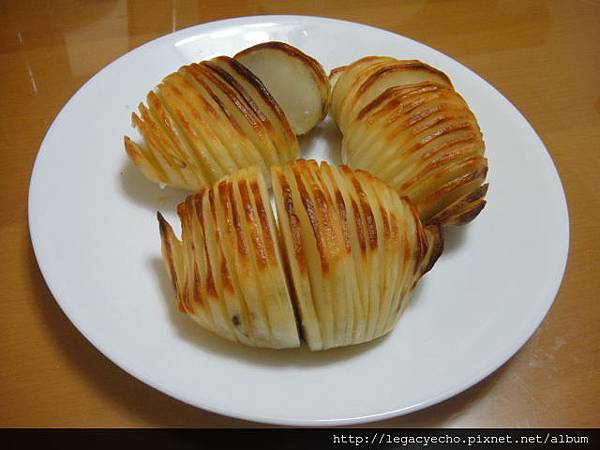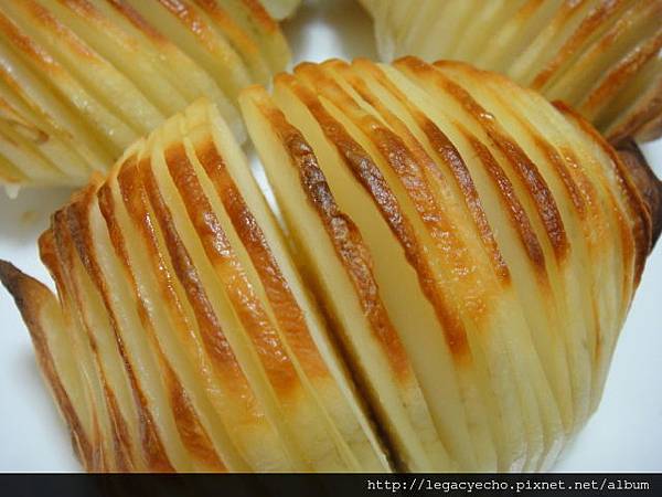 將馬鈴薯薄切0.2公分寬,但是不完全切斷,泡一下鹽水,放入烤箱,先以中火烤熟,然後再淋上少許夏威夷豆風味油,以上火將表面略微烤出焦褐色。