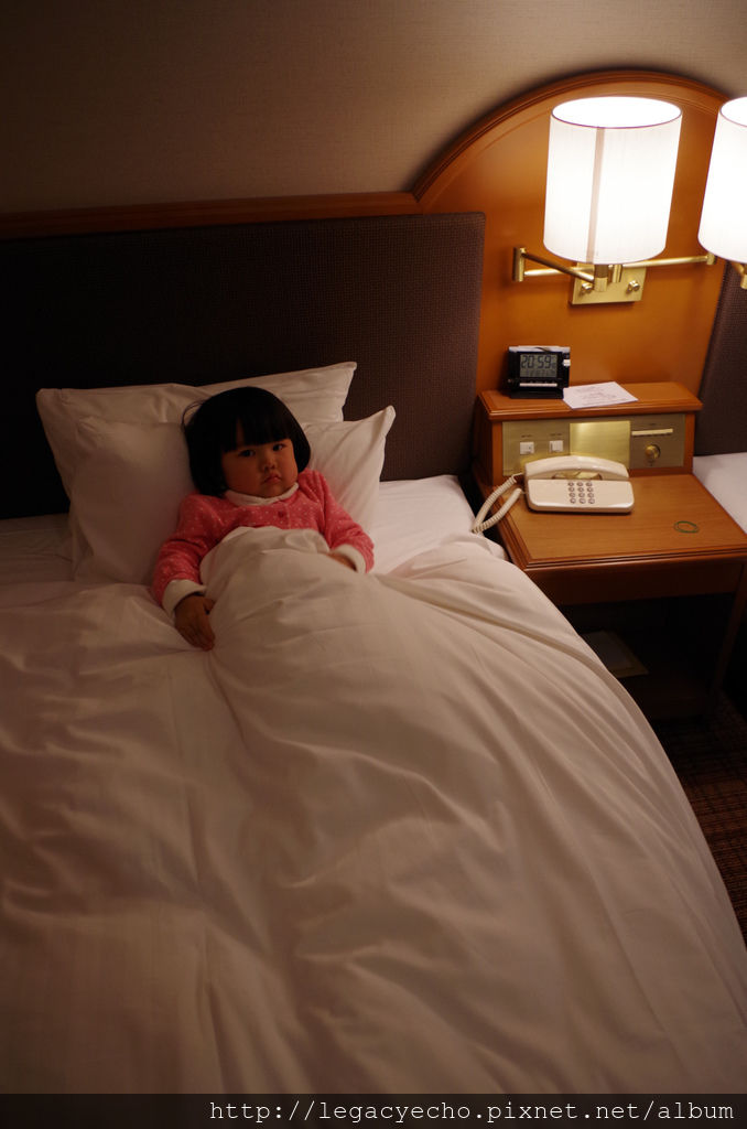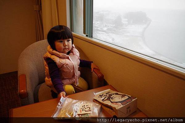 坐在飯店窗前等待琵琶湖日出的亮亮...