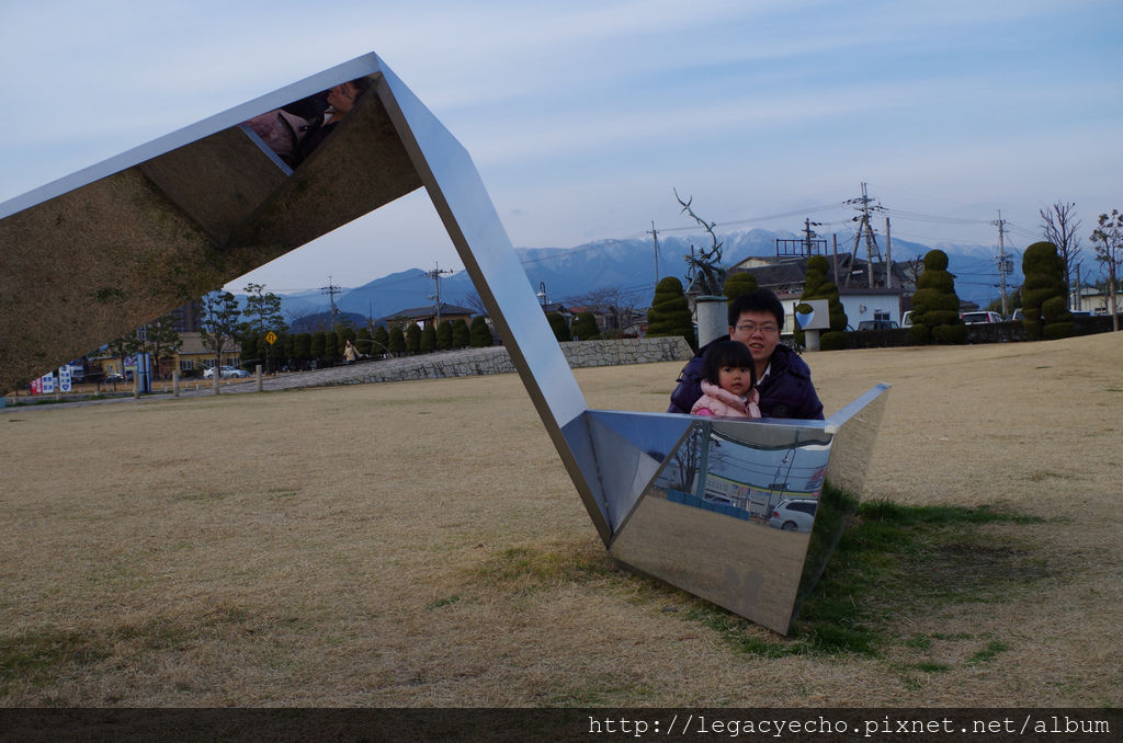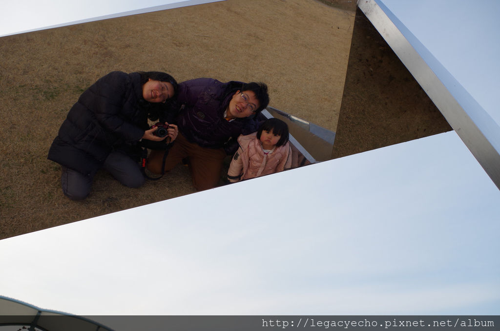 鏡面鋼板的雕塑品產生各個不同角度的折射,亮亮和爸媽扮鬼臉很開心,鼻子凍得紅紅的也無所謂。