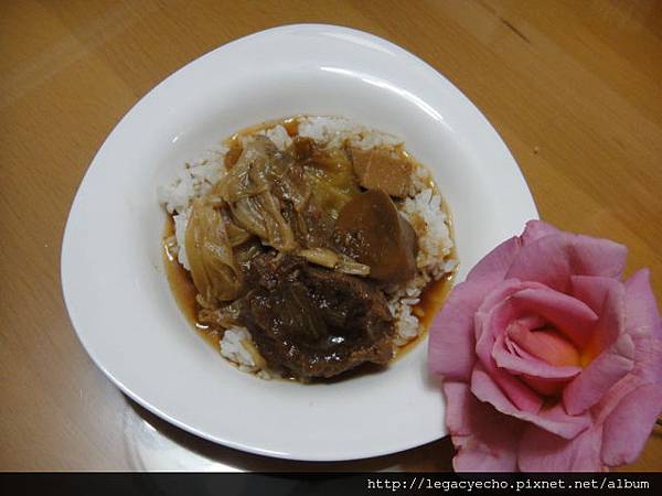 今天的晚餐高麗菜乾牛腱肉湯汁淋飯,加上費力上了陽台剪了一朵盛開的玫瑰。