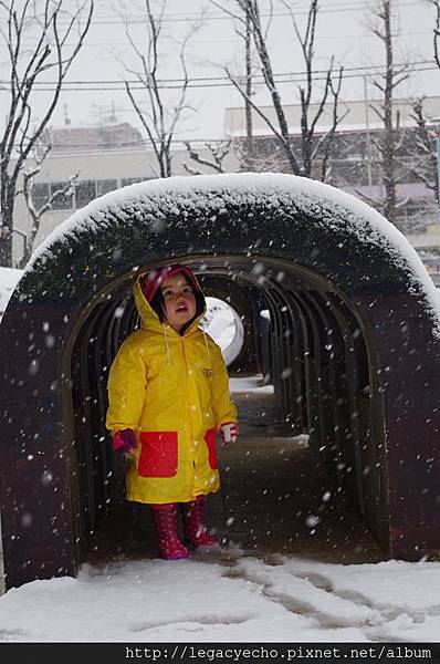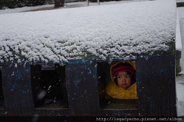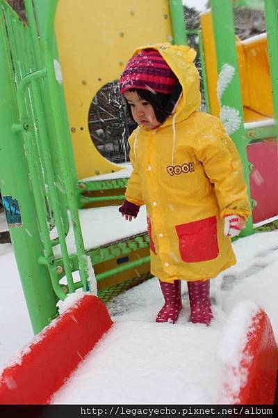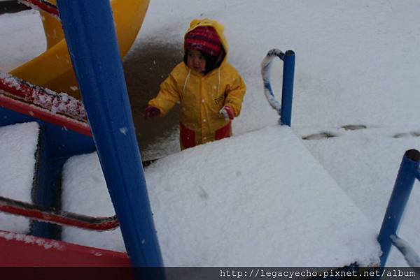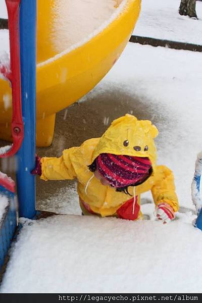 溜滑梯藏在雪堆裡,亮亮小心地爬著階梯,彷彿在征服一座高山。