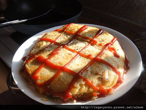 帶料的麵餅從煎鍋輕輕滑出瓷盤,在下少許油煎蛋,緊接著將帶料的麵餅翻面蓋上,呈現下圖模樣,其實到這裡樣貌完美無瑕。