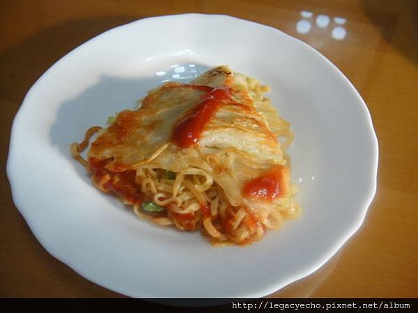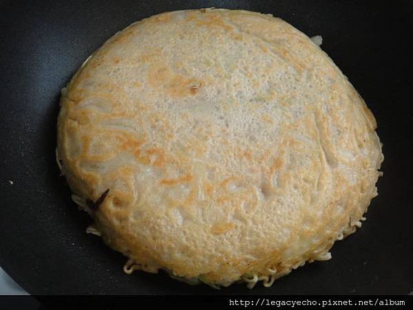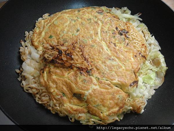 為了讓各位看倌看一遍加了煎蛋那一面的狀況,我又加翻了一次面,這一面屬於加上高麗菜絲、泡麵及蛋,因此比較不整齊。