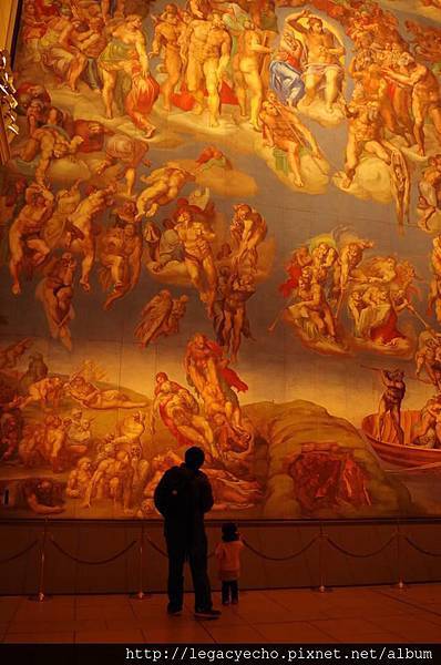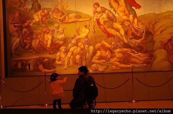 踏入美術館,展覽動線則直接由地下三樓的環境展覽館開始,首先映入眼簾的是梵諦岡的西斯汀禮拜堂,天花板及牆壁上的米開朗基羅的畫作。在這樣莊嚴的氛圍中,亮亮馬上變換成文靜氣質的模樣。