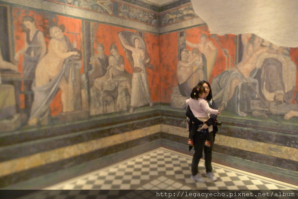 源自於龐貝古城出土的建設中酒莊莊園,以崇拜酒神狄俄尼索斯之信徒皈依為題材的「秘密儀式」大幅壁畫。