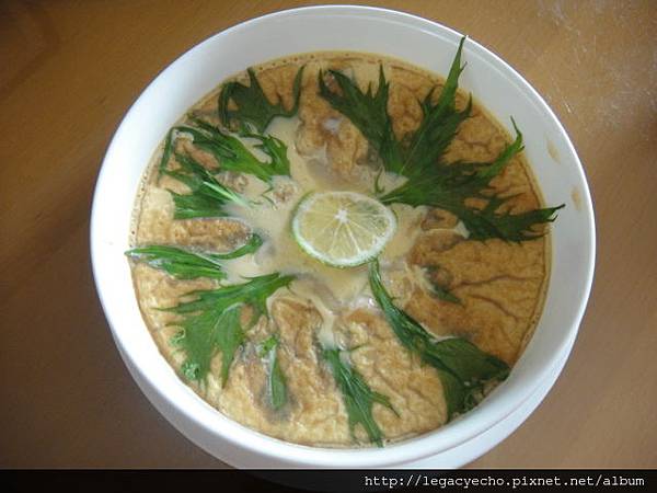 做了柴魚汁蒸蛋,讓京都水菜的菜葉,漂浮成花,青澀檸檬的滋味點綴其中,願這陣子心中的酸苦可以轉化成美麗的記憶。