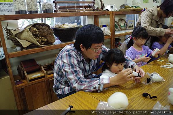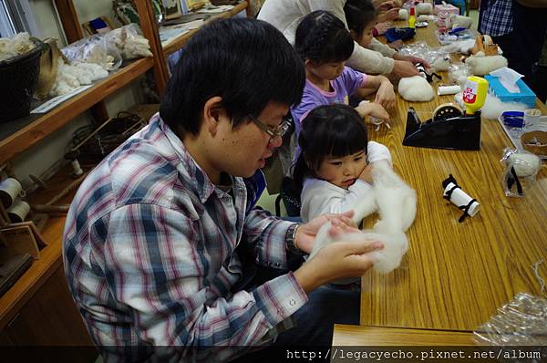 當亮爸爸專心聽著老師解說製作過程時,亮亮忍不住拿起羊毛摩擦臉頰,體驗這和穿毛衣的感覺一樣不一樣?