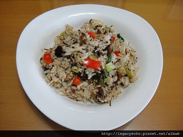 回到家,切了半顆洋蔥末、蔥末炒飯,加入滷牛腱邊角肉、紅椒丁拌勻,盛盤上桌。