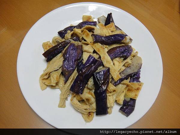 茄子對切泡水,用少許紅椒風味酪梨油煎,茄皮朝下熱油易定色,少許水續燜熟,收汁後,一樣少許岩鹽及胡椒調味,腐皮切條狀入鍋一起拌勻盛盤。