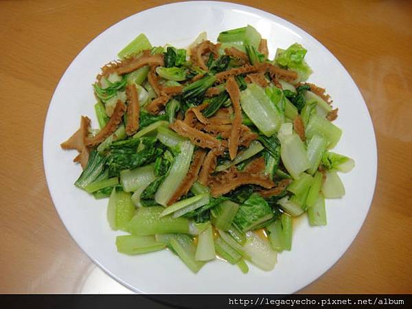 滷牛肚絲炒清泉菜,附近黃昏市場的有機菜攤賣各式各樣蔬菜,清泉菜的味道介於青江菜與小白菜的融合,用一點台南東市場馮家牛肉的滷牛肚絲,少許胡桃油拌炒,非常對味。