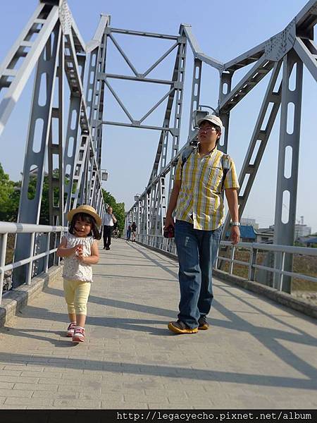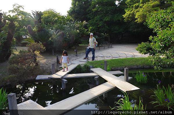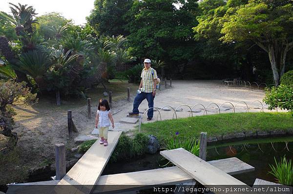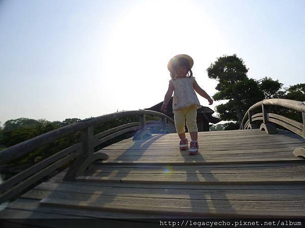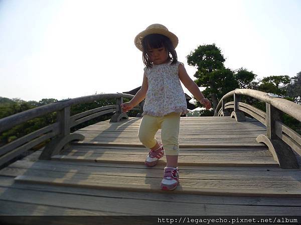 亮亮走在通往中之島的圓拱型木橋上,要控制好腳步,免得打滑。