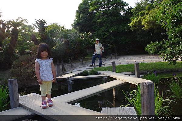 不太放心還回頭看亮媽咪有沒有跟來,緊接著自己獨自走過石板架設的浮橋。