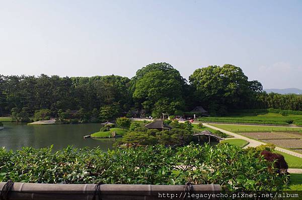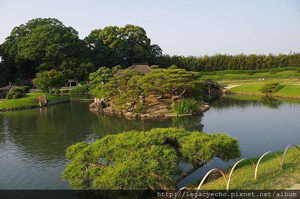 唯心山下是園區內最大水塘「澤之池」,照片右方塘泊內的「中之島」設有茶室;中間的「御野島」設有釣殿;左側「砂利島」則是白沙青松圍繞。