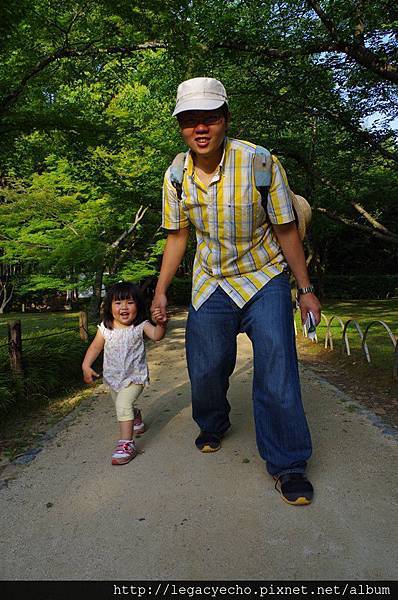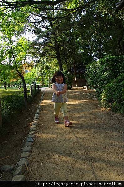 櫻花與楓葉兩色交替的園林,在夏季卻只有長青一色,亮亮散步其中,開心極了。