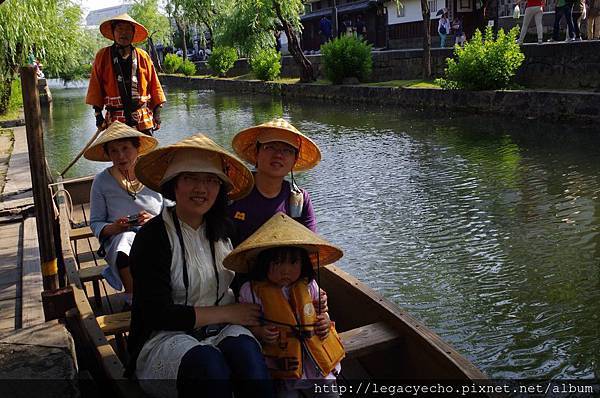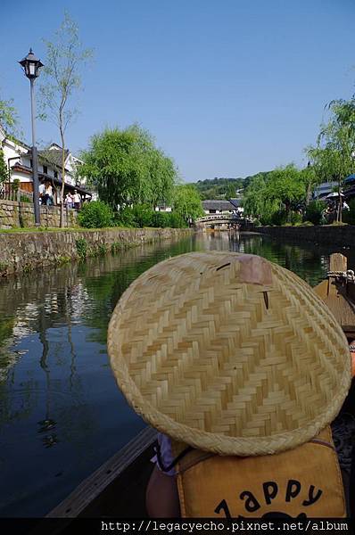 平底木舟由身穿號衣、頭戴斗笠的船夫以長竿撐入水中,載著遊客在倉敷川上緩緩地漂移,微風輕拂,垂柳搖曳。
