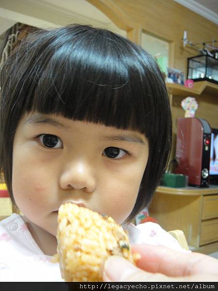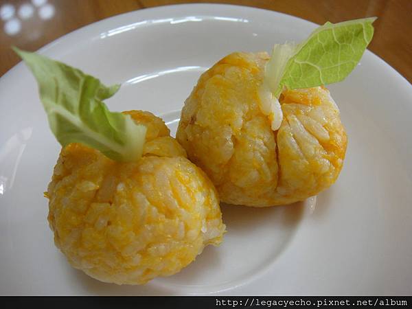 做南瓜燉飯時,隨手為亮亮捏兩個像小金桔的飯糰。